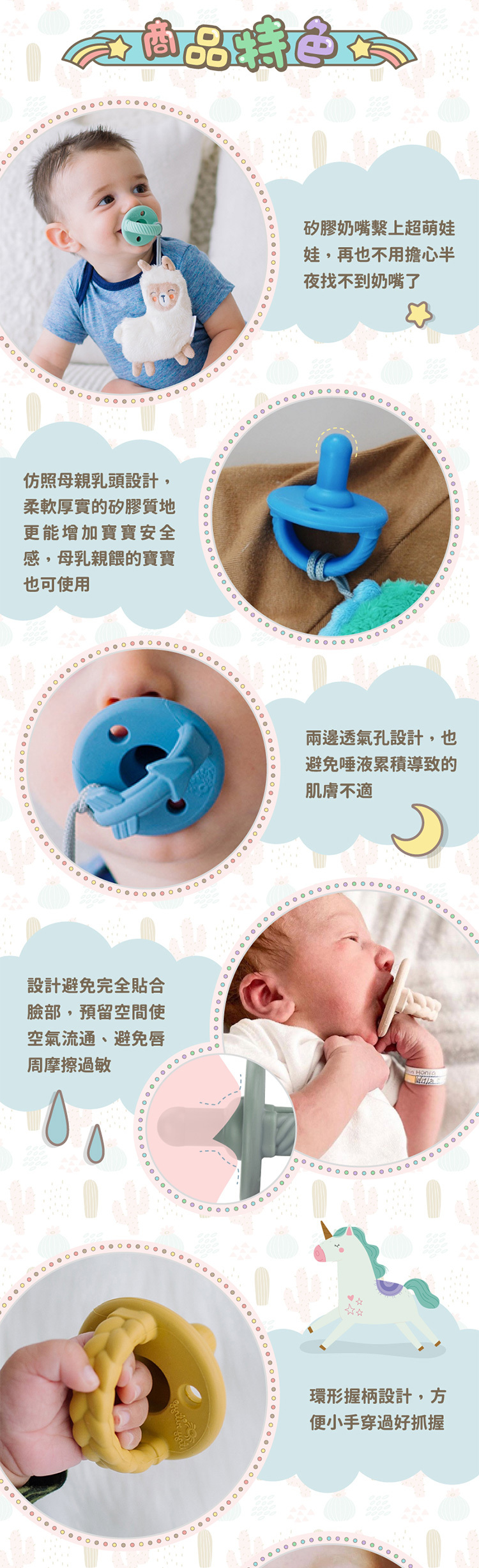 -奶嘴仿照母親乳頭設計,柔軟厚實的矽膠質地更能增加寶寶安全感