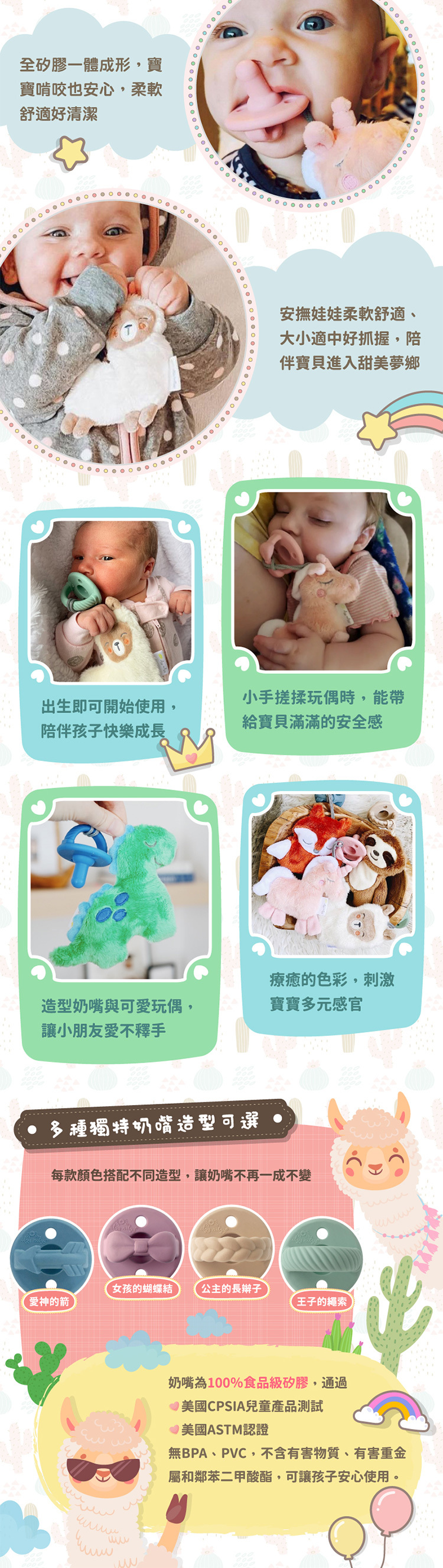-奶嘴為食品級矽膠,通過美國ASTM認證、CPSIA兒童產品測試