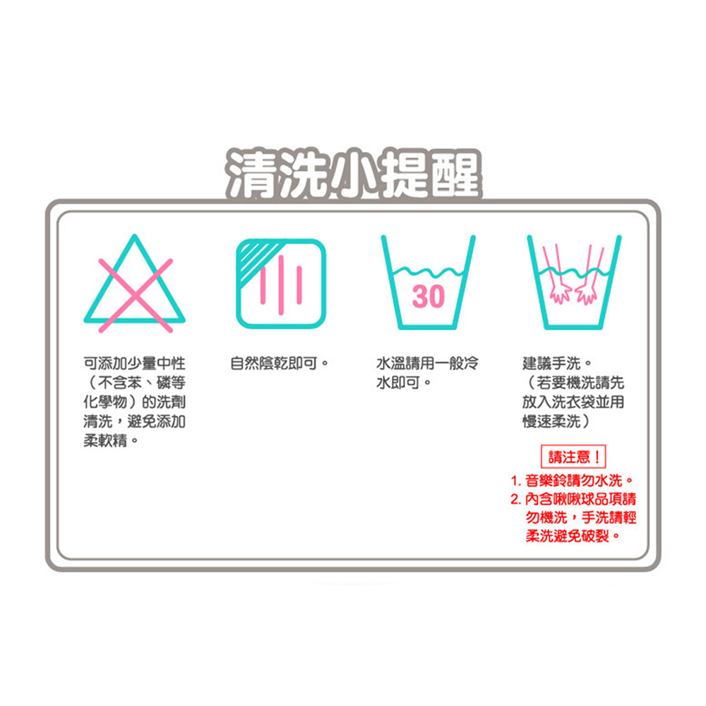 清潔方式:手洗請輕柔清洗以避免商品損壞,機洗請放入洗衣袋並使用慢速柔洗,放置通風處陰乾
